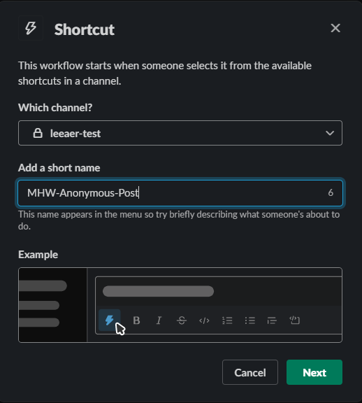 Pick the Channel you want to use the Workflow in and add the name you want it listed as. Click Next when done.