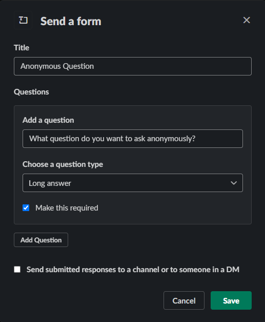 The form is what the anonymous poster will see when submitting their question. Add a title to the form, language for the question, length of the question (long or short), and make it required. Make sure to uncheck “Send submitted response to a channel or to someone in a DM.” That will send the question and not be anonymous. Click Save when done.