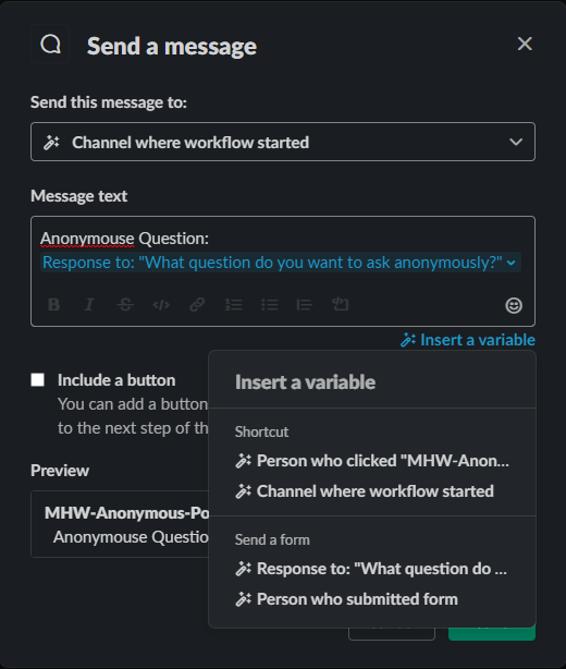 Next to Send this message to:, click the drop-down and select Channel where workflow started. The Message text field can be customized as needed. To get the question asked in the previous step, click Insert a variable just under the text field and select Response to: “What question do …”. You can see the form output at the bottom of the step. Once you like the format, click Save.